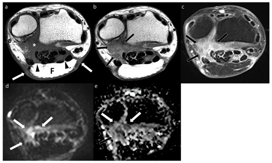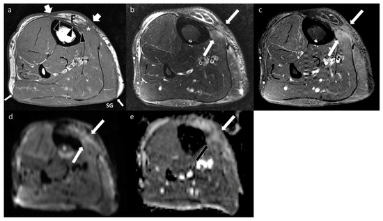 Postoperative MRI obtained from the leg of a 46-year-old woman who underwent surgical resection of myxofibrosarcoma with immediate local flap reconstruction at the anterior tibial region 6 months prior. (a) Axial T1WI shows a flap (F) with peripheral (arrows) and deep (arrowheads) margins on the anteromedial side of the leg. Ill-defined isointense lesion (asterisk) involved deep and peripheral margins of the transplanted tissue. The skin graft (SG) is noted as a thin hypointensity overlying the gastrocnemius muscle. The peripheral margin of the skin graft is indicated by thin arrows. (b) Axial T2WI shows ill-defined nodular hyperintense lesion (arrows). (c) Axial contrast-enhanced FS-T1WI shows moderate enhancement (arrows). (d,e) This lesion (arrows) represents facilitated water diffusion seen as hyperintense signal on axial DWI with a b-value of 800 s/mm2 (d) and high ADC (e). This lesion decreased in size in follow-up MRI without other treatment; it was then presumed as a postoperative change.