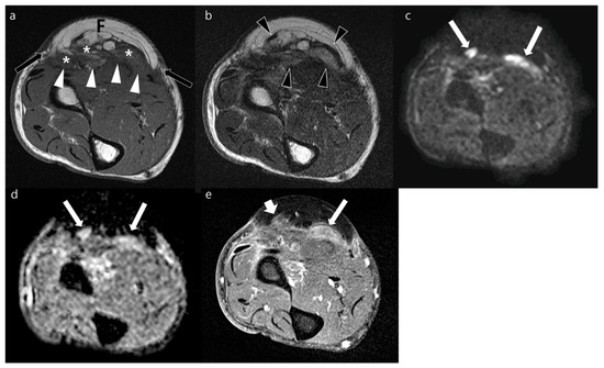 Postoperative MRI obtained from the forearm of a 77-year-old man who underwent surgical resection of myxofibrosarcoma with immediate free flap reconstruction in the forearm 6 months prior. (a) The axial T1WI shows flap (F) with peripheral (arrows) and deep (arrowheads) margins in the volar side of forearm. Ill-defined, heterogeneous lesions (asterisks) are seen along deep margin of the transplanted tissue. (b) Axial T2WI shows ill-defined nodular hyperintense lesions (arrowheads). (c,d) These lesions (arrows) represent facilitated water diffusion seen as hyperintense signal on axial DWI with a b-value of 800 s/mm2 (c) and high ADC (d). (e) Axial contrast-enhanced FS-T1WI shows focal enhancement of moderate (arrow) and mild (short arrow) degrees. These lesions decreased in size and finally disappeared in enhancement in serial follow-up MRIs without other treatment; they were then presumed as postoperative changes.
