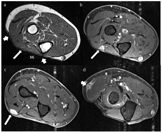 Postoperative MRI obtained from the forearm of an 88-year-old woman who underwent surgical resection of myxoid liposarcoma with immediate skin graft at the forearm 4 years prior. (a) The axial T1WI shows skin graft (SG) with peripheral (short arrows) margins on the dorsal side of forearm. An isointense nodule involves the deep margin of the transplanted tissue (arrow), which was not well delineated because of similar signal intensity with that of perilesional muscle. (b) Axial contrast-enhanced FS-T1WI obtained at the same section with (a) shows moderate enhancement of lesion (arrow) at the deep margin of SG. (c) Axial contrast-enhanced FS-T1WI obtained 2.4 cm distal to (a,b) shows another lesion arising from peripheral margin (arrow). This lesion has a well-defined nodular appearance with intense enhancement. (d) Axial contrast-enhanced FS-T1WI obtained 2.0 cm proximal to (a,b) shows another lesion in the regional location, which was apart from transplanted tissue (arrow). This lesion has a well-defined nodular appearance with moderate enhancement. These three lesions were confirmed as recurrence of myxoid liposarcoma via excisional biopsy.