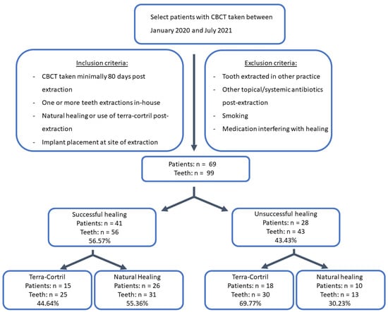 Seventy-five patients could be identified, of whom five were excluded because of smoking and one because of the use of bisphosphonates. Hence, 69 patients were included, with a total of 99 tooth extractions. The exposure cohort included 55 sites, while the non-exposure cohort included 44 sites. Fifty-six sites demonstrated successful healing and 43 showed unsuccessful healing.