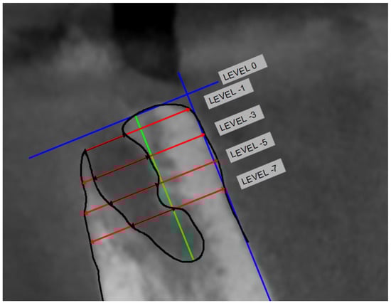 The horizontal and vertical dimensions of the bony defect (BD) were measured on the CBCT [,]. Horizontal bony defects were measured at levels −1 (L1), −3 (L3), −5 (L5) and −7 mm (L7) from the marginal bone of the socket (L0) as a percentage of bone defect, and as the greatest horizontal defect on the corresponding level (Hmax). Vertical loss was measured as the greatest vertical defect from marginal to apical of the socket (Vmax) (Figure 3).