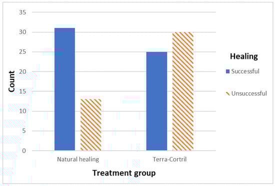 A multiple binary logistic regression analysis correcting for confounding was performed to determine the association between potential factors and the healing outcome. The results of the final adjusted model only include the treatment group (p = 0.014) as a significant predictor of the healing outcome, increasing unsuccessful healing with an OR of 2.86 when TC was used.