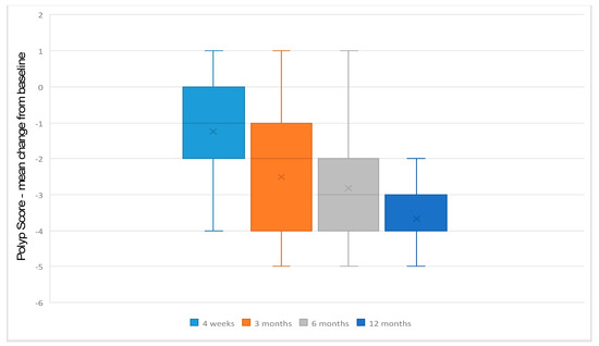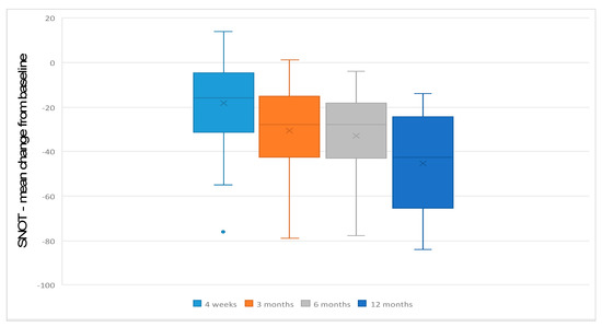 Boxplot displaying the mean change from baseline in SNOT-22 total score 4 weeks, 3, 6 and 12 months after the initiation of the treatment.