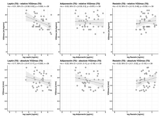 Although, as shown in Figure 1, there was no correlation between baseline leptin concentrations and baseline relative (rho = −0.31, p = 0.056), baseline leptin concentrations predicted 14% of baseline variance in relative . These data suggest a close relationship between leptin concentrations and . However, leptin concentration was a much weaker predictor of cardiorespiratory fitness when absolute instead of relative was analyzed: Baseline leptin concentrations only predicted 8% of baseline variance in -abs. Moreover, baseline adiponectin and resistin concentrations did not correlate with baseline fitness (Figure 1).