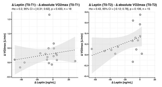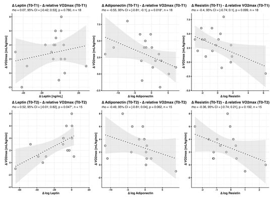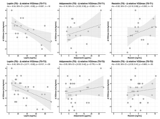 Our primary goal was to evaluate whether baseline adipokine levels might be predictors of subsequent training-induced gains in aerobic fitness. Overall, we observed a significant increase in maximum relative oxygen consumption () between T0 and T1 (2.6 mL/kg/min, p < 0.001) and T0 and T2 (2.0 mL/kg/min, p = 0.001) [11].