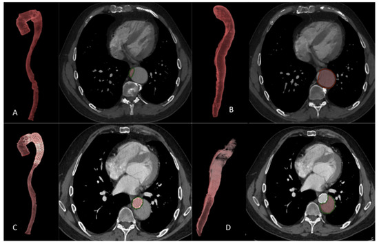Aortic volume measurement. Aortic volume measurement after true lumen (A–C) selection and false lumen (B–D) selection: (A,B): preoperative CT scan (C,D): postoperative CT scan.