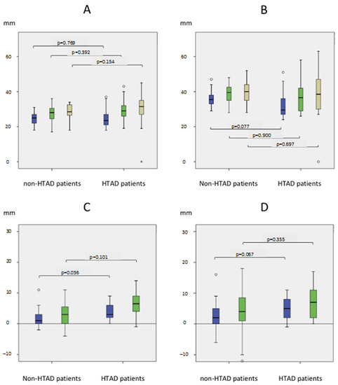 At T0, the HTAD patients had a lower false lumen volume (264.8 ± 100.4 mL) than the non-HTAD patients (380.2 ± 181.3 mL) (p = 0.036), leading to a lower total volume of the aorta (504.5 ± 144.3 mL vs. 652.8 ± 173.5 mL; p = 0.005).