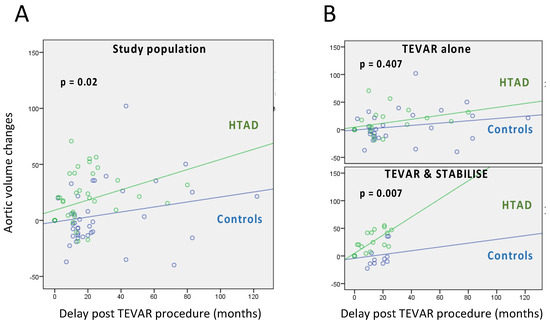 In Figure 4A, with a linear model, we observed a significantly different aortic volume evolution between the two groups (p = 0.02).