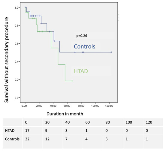 The mean survival without reoperations was similar in the HTAD group (40.9 ± 6.3 months) and the non-HTAD group (77.2 ± 14.1 months) (p = 0.25; Figure 5).