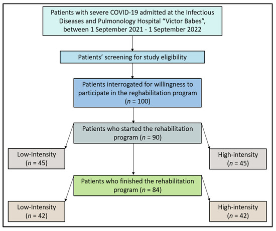 A convenience sampling method was employed to estimate the appropriate size of the patient sample, which was calculated for 35 patients for each patient group, at a confidence level of 95% and a margin of error of 10%. The patients included in the study were adults (18 years or older) who had been diagnosed with severe COVID-19, as defined by the World Health Organization [19]. The diagnosis had been confirmed via a positive SARS-CoV-2 PCR test [20], and the medical histories of the patients were retrieved from the paper and digital records based on the ICD-10 diagnostic codes [21]. All the records were checked for the patient’s consent to participate in medical research studies. The patients were proportionally matched by age, gender, and vaccination status to reduce bias. Further stratification was implemented based on the type of rehabilitation protocol (low intensity or high intensity) by randomization, resulting in two equal study groups that underwent low-intensity and high-intensity workout, respectively. The rehabilitation program started at discharge from the infectious diseases department, after the SARS-CoV-2 infection was cleared and confirmed via a PCR test.