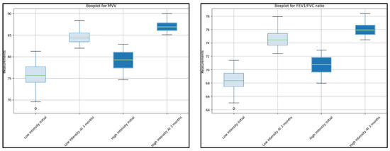 The forced vital capacity (FVC) increased significantly in both groups. The low-intensity group saw an increase from 73 (IQR 70–79) to 85 (IQR 81–88), p = 0.004, while the high-intensity group saw an increase from 76 (IQR 72–81) to 85 (IQR 80–88), p = 0.007. The forced expiratory volume in 1 s (FEV1) improved significantly in both groups. The low-intensity group saw an increase from 75 (IQR 70–80) to 83 (IQR 82–86), p = 0.009, and the high-intensity group saw an increase from 74 (IQR 70–80) to 87 (IQR 85–91), p-value of less than 0.001. The FEV1/FVC ratio improved significantly for both groups, as described in Figure 2. The low-intensity group improved from a median of 68 (IQR 65–71) to 75 (IQR 72–78), p-value of less than 0.001, while the high-intensity group improved from 70 (IQR 67–73) to 76 (IQR 74–78), p = 0.010. The peak expiratory flow (PEF) showed a significant increase in both groups. The low-intensity group improved from 76 (IQR 72–80) to 81 (IQR 78–85), p = 0.012, and the high-intensity group improved from 79 (IQR 75–83) to 81 (IQR 79–85), p = 0.020. The forced expiratory flow at 25–75% (FEF 25–75) showed a significant increase for both groups. The low-intensity group improved from a median of 78 (IQR 74–82) to 84 (IQR 82–90), p = 0.005, while the high-intensity group improved from 81 to 83 (p = 0.022).