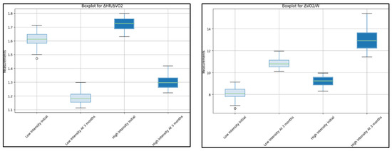 Both groups showed a significant increase in heart rate (HR) from the maximum. The low-intensity group increased from 60 to 75 (p = 0.020), and the high-intensity group increased from 65 to 82 (p = 0.006). The ΔHR/ΔVO2 decreased significantly in both groups. The low-intensity group reduced from 1.60 (IQR 1.5–1.7) to 1.20 (IQR 1.1–1.3), p = 0.007, and the high-intensity group reduced from 1.7 (IQR 1.6–1.8) to 1.3 (IQR 1.2–1.4), p = 0.001. The ΔVO2/W (Figure 3) demonstrated significant increases for both groups. The low-intensity group improved from 8 (IQR 7–9) to 11 (IQR 10–12), p = 0.030, and the high-intensity group improved from 9 (IQR 8–10) to 14 (IQR 10–15), p = 0.008. Similarly, the ΔVO2/HR increased significantly for both groups. The low-intensity group improved from 9 (IQR 8–10) to 12 (IQR 11–13), p = 0.009, and the high-intensity group improved from 10 (IQR 9–11) to 13 (IQR 12–14), p = 0.045. Finally, the breathing reserve (BR) increased significantly in both groups. The low-intensity group improved from 15 (IQR 12–18) to 24 (IQR 22–26), p-value of less than 0.001, and the high-intensity group improved from 18 (IQR 15–21) to 29 (IQR 27–31), p = 0.010.