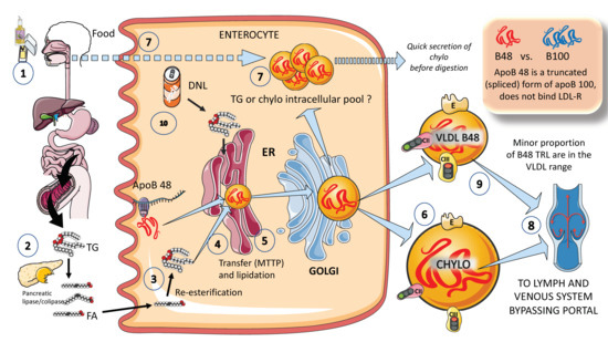 Production of exogenous triglyceride-rich lipoproteins (TRLs) by the liver: Chylomicrons and VLDL apoB48. (1) Lipids in the diet are (2) digested by pancreatic lipase, which is activated by liver co-lipase, in a complex system of micelles, resulting in the absorption of fatty acids and monoglycerides. (3) Fatty acids are re-esterified by the enterocyte and the resulting TGs (4) serve to lipidate apoB48. The latter is a truncated, spliced form of apoB100, which lacks the LDL receptor binding sites. (5) Much less is known about the transit and steps in chylomicron production as compared to VLDL. The resultant chylomicrons, which are very large particles, are (6) secreted into the circulation (7). However, very recently it has been shown that some of them are either stored as an intracellular pool or swiftly produced from TG droplets that can be called upon very quickly when the next meal comes, following signals stemming from the intake of more food and even before it reaches the intestines. (8) Chylomicrons secreted into the circulation contain phospholipids, cholesterol, and the liposoluble vitamins and are first transported by the lymph, reaching the venous, and finally the arterial circulation in a third step. (9) It has recently been shown that some of the apoB48-containing lipoproteins coming from the intestines are also in the VLDL size range. The figure was partly generated using Servier Medical Art, provided by Servier, licensed under a Creative Commons Attribution 3.0 unported license.