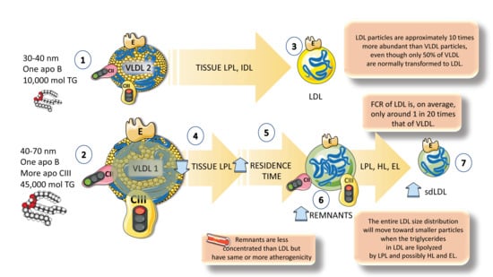 Another layer of complexity: differences between VLDL1 and VLDL2 catabolism. (1). VLDL2 is a particle of 30 to 40 nanometers and contains 10,000 moles of TGs. (2) VLDL1 instead, is twice as large (40 to 70 nanometers) and contains 45,000 moles of TGs. (3) VLDL2 tends to follow a more regulated and faster pathway leading to the production of LDL particles. Turnover of LDL is 20 times slower than that of VLDL and that is the reason why LDL particles are approximately 10 times more abundant than VLDL particles. Moreover, only 50% of VLDLs are normally transformed into LDLs, the rest are intermediate-density LDLs (IDLs) and other remnants. (4) VLDL1 contains far more apoCIII, which is the main inhibitor of lipoprotein lipase. Consequently, its catabolism tends to be slower, with an increased residence time. (5, 6) The accumulation of more remnants creates opportunities for the interaction with hepatic and endothelial lipase, which leads to the production of (7) smaller LDL particles, which are more atherogenic than large, buoyant LDLs. The figure was partly generated using Servier Medical Art, provided by Servier, licensed under a Creative Commons Attribution 3.0 unported license.