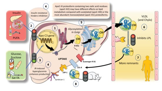 The deregulation of apoCIII metabolism observed in people with diabetes appears to be the logical result of the combined actions of insulin and glucose. Additionally, saturated FA stimulate and polyunsaturated FA (PUFA) inhibit ApoCIII expression. In this regard, insulin resistance negates the inhibition promoting increased expression of apoCIII followed by a delayed catabolism of TRLs, as seen in MetS and diabetes, and at the same time produces hyperglycemia, which directly stimulates the production of apoCIII (Figure 6). Independent of this, diets very rich in sugar or saturated fat enhance the production of apoCIII [45,46,75,76]. ApoCIII is a small protein that gets glycosylated in the Golgi apparatus and circulates in three isoforms with 0, 1 (most abundant), or 2 sialic acid residues, as shown in the figure. Isoform distribution may have a bearing on the final activity of the protein. ApoCIII in VLDL and chylomicrons (which get it by transfer from VLDL or from HDL) potently inhibits lipoprotein lipase activity and acts as a counterpart of the main activator, which is ApoCII. Other key inhibitors are apoAV and ANGPTL3-4 and 8, as we show later. Excess activity of apoCIII results in increased residence time of VLDL and chylomicron remnants [10,77]. As shown before, remnants are taken up by several receptor mechanisms in the liver. ApoCIII also inhibits this reuptake, especially in rodents [25,28]. Human studies support a major role for apoCIII as an inhibitor of LPL-mediated lipolysis, while mouse data support a chief role for apoCIII as an inhibitor of the removal of remnants of VLDL and chylomicrons by the liver, with minimal effect of LOF of apoCIII on hepatic remnant removal, except when LPL activity is significantly reduced or completely absent. Dietary intervention by reducing fructose consumption is a potent reducer of apoCIII, as we have recently shown [46,47]. The key role of apoCIII as an LPL inhibitor, as well as results from animal and human loss of function studies, have also uncovered the potential role of apoCIII inhibitors as a therapeutic avenue for hypertriglyceridemia, as we further discuss in this review.
