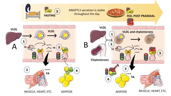 Insulin enhances the secretion of ANGPTL3 and ANGPTL8, and ANGPTL8 is elevated during eating. As shown in Figure 7B, in the postprandial state (when insulin levels are high), the presence of ANGPTL3 and ANGPTL8 in muscle decreases LPL activity and promotes TRL-triglyceride flow to adipose tissue. Endothelial lipase levels have also been shown to be suppressed by ANGPTL3 [83,84,85]. The key role of ANGPTL3 in this process, as well as results from animal and human loss of function studies, have uncovered the potential role of ANGPTL3 inhibitors as a therapeutic avenue for hypertriglyceridemia, as we further discuss in this review. Moreover, we have shown that higher ANGPTL3 can be found as early as in adolescents [72,77] with MetS and that, in an ongoing investigation, fructose restriction reduces their fasting and postprandial ANGPTL3. A better knowledge of the regulation of LPL has been achieved in the past few years with the discovery of the action and mechanisms of ANGPTL proteins together with apoAV (see below) being a strong activator of LPL.