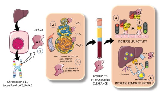 Apo AV a unique modulator of fasting and postprandial TGs: the new frontier? The locus ApoA1/C3/AIV on chromosome 11 has shown singular importance in lipid metabolism. In the past two decades, a new apo A, apoAV has been discovered and intensively studied. (1) ApoAV is 39 kDa protein synthesized exclusively by the liver which (2) circulates in HDL, VLDL, and chylomicrons but not in LDL. It circulates in extremely low concentrations but has proven to have strong activity as an LPL activator. (3) Indeed, its concentration is 1000-fold lower than that of apoB100 and 10,000 lower than that of apoAI. (4) Apo AV disrupts the inhibitory effect of the complex ANGPTL3-8, thereby (5) activating LPL. Some recent data indicate that it might also increase liver remnant uptake and removal. The figure was partly generated using Servier Medical Art, provided by Servier, licensed under a Creative Commons Attribution 3.0 unported license.
