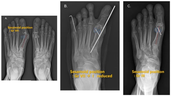 The present study is limited by its retrospective nature and the short-term follow-up data used. Our follow-up period was relatively short (18.4 months and 15.0 months, retrospectively). However, percutaneous metatarsal osteotomy was reported to be a safe and effective technique. Jeyaseelan and Malagelada reported that for minimally invasive hallux valgus surgery, the radiological and clinical outcomes seem to be comparable to those of open procedures []. A long-term follow-up of S.E.R.I should be conducted. Furthermore, we did not exclude cases that included the Akin procedure. This additional procedure may have affected the radiological results. In addition, in the patients who underwent S.E.R.I., the procedures were performed without an additional procedure; therefore, it seems unlikely that the additional procedures affected the radiographic results in the present study. Furthermore, we did not consider the factor of first-ray hypermobility in relation to hallux-valgus-deformity recurrence. We believe that there is no direct impact of hypermobility on the recurrence of hallux valgus. This study is also limited in that the position of the sesamoid bone on weight-bearing AP radiography may not accurately represent its true anatomical position due to various factors, mentioned above. Therefore, this study proposes the need for new anatomical criteria regarding the observed position of the sesamoid bone on weight-bearing AP radiography.