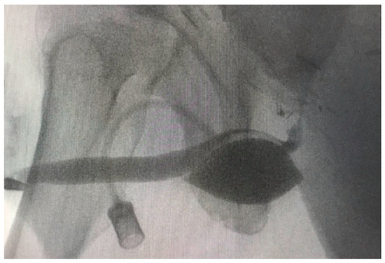 At 4–6 weeks follow-up, our patients were presented as outpatients. A 24-h-pad test, ICIQ-SF, PGI-I, and uroflowmetry/bladder sonography were routinely performed. If necessary and after ruling out symptomatic bladder voiding dysfunction, an adjustment was performed, with 2–5 mL of saline solution administered per outpatient visit. If there was no significant improvement in incontinence with >15 mL ATOMS volume, a RUG was performed after prior application of 2 mL of iodine contrast medium via the port to assess the device position and relationship to the urethra. If this positional check revealed an unfavorable position (e.g., incorrectly oriented towards the penile perpendicular axis of the ATOMS cushion, no support of the bulbar urethra, Figure 1), revision with repeat ATOMS implantation was indicated; if the position of the cushion was acceptable but incontinence persisted after further adjustment, implantation of an artificial sphincter was recommended.