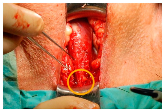 Figure 2. Perineal wound, the bulbospongiosus muscle is exposed, caudally the central perineal tendon can be identified (orange circle), which can be easily transversely incised, thus mobilizing the bulb and creating space for a silicone pad. - The foramen obturatorium was punctured at its mediodorsal angle, approximately 1.5 cm below the previous insertion (Figure 3). The blue helix needles were used, which have a smaller diameter than the red helix needles (Figure 4);