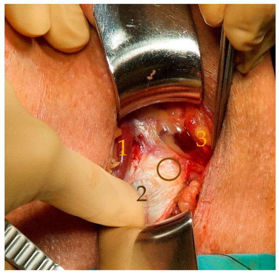 Figure 3. The bulb is medialized with the bulbospongiosus muscle (1). This allows the proximal extension of the left corpus cavernosum to be identified on the inferior ramus of the pubic bone (2). The finger passes beneath the palpable lower medial edge of the pubic bone. At a 45° angle lateroventral to this edge, a gap in the obturator foramen is palpable, which can be punctured with the tunneler (circle). The vascular-nerve bundle is laterally displaced to prevent compression of the nervi scroti posterior and thereby avoid prolonged pain (3) (for better visibility, we used a picture of a patient with the first ATOMS SSP implantation).