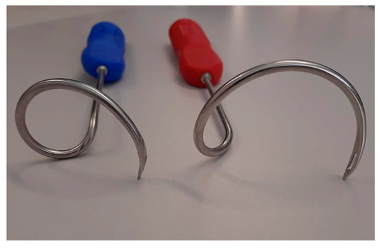 Figure 4. A.M.I. Gmbh distributes different tunnellers. For the proximal implantation, the blue one enables the passage of the foramen obturatorium in a confined space. This helps to protect surrounding structures such as the rectum and enables ideal placement of the needle tip and consecutively of the mesh arms in the urogenital hiatus (Figure 5). The use of the red tunneller is also possible but requires special protection of the rectum during the passage of the foramen by manual dorsal compression. - Delivery of the tip of the tunneller paraurethrally below the hiatus urogenitalis, underneath the membranous urethra. As previously described by Rheder et al. for the fixed male Sling Advance, the entrance of the introducer needle tip into the perineal wound should be in the uppermost corner between the inferior pubic ramus and urethral bulb (Figure 5);