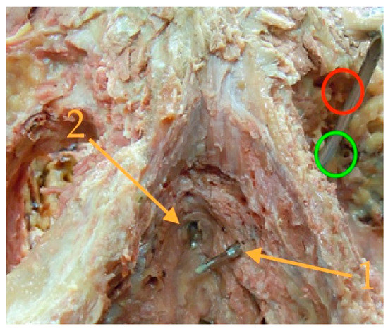 Figure 5. (Picture with kind permission of Dr. Rheder, Innsbruck) The prepared pelvis demonstrates the ideal position of the tip of the tunneller: The insertion point (green circle) is located ventrolateral of a small palpable pubic edge (the red circle marks the usual TOT-needle insertion which is not useful for ATOMS placement). The needle tip should be exited in the urogenital hiatus (1), lateral and below the membranous urethra (2). For this purpose, the grip hand should be slightly lowered after perforation of the outer and inner membrane of the obturator foramen. The same needle positioning is also recommended for the fixed male sling. - The tunneled mesh arms were fixed using high tension to achieve an increased contact pressure of the cushion (in Cases 3 and 4) (Figure 6).