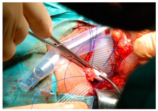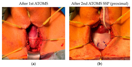 During the outpatient follow-up after 4–6 weeks and any necessary further adjustments, all patients showed an improvement in continence compared to the situation with the implanted and adjusted 1st ATOMS cushion. Case 2 experienced a slight improvement in urinary incontinence. Imaging showed a rather dorsal placement of the silicone pad (Figure 7b’). We then further adapted our technique in Cases 3 and 4 and added the tight mesh fixation (Figure 6). Figure 8 shows the intraoperative image of Case 1, where the pseudocapsule of the old cushion is located distally and thus covers the penile urethra distally, while the 2nd ATOMS is approx. 1.5 cm lower/proximal immediately underneath the bulbar urethra.