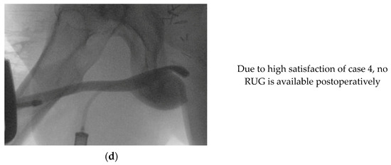 For demonstration purposes, a repeat RUG was performed in our cases (Figure 7: Cases 1 and 2 showed an improved position, and in both patients, an improvement of continence could be observed). In Cases 3 and 4, where tight mesh fixation was used, good continence was achieved. In RUG of Case 3, an idealized position with the support of the proximal bulbar urethra was observed (Figure 7c’ and Figure 9). In Case 4, the patient was fully satisfied so no adjustment and consecutively no postoperative RUG was performed.