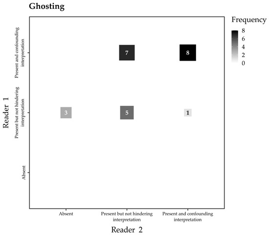 - Presence of ghosting artifacts, on a three-level ordinal scale (“Present and confounding interpretation”, “Present but not hindering interpretation”, and “Absent”)