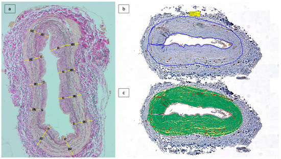 (b) A study of vascular density was carried out. Analysis of CD31 immunostained sections was performed at the 1st Department of Pathology and Experimental Cancer Research, Semmelweis University. The Panoramic Scan System (3D Histech Ltd., Budapest, Hungary) was used to digitize these 42 slides. Using the Panoramic Viewer program, tissue sections corresponding to the vascular well were manually annotated while excluding the endothelial lining of the intima and the vasa vasorum containing adventitia. Within the selected annotations, the Pattern Quant module of the Quant Center software package (3D Histech) was trained to provide automated differentiation between CD31-stained vascular structures, the background, and counterstained tissues (Figure 1b–c). The segmented areas were measured in µm2, and the positive surface area was estimated from the results.