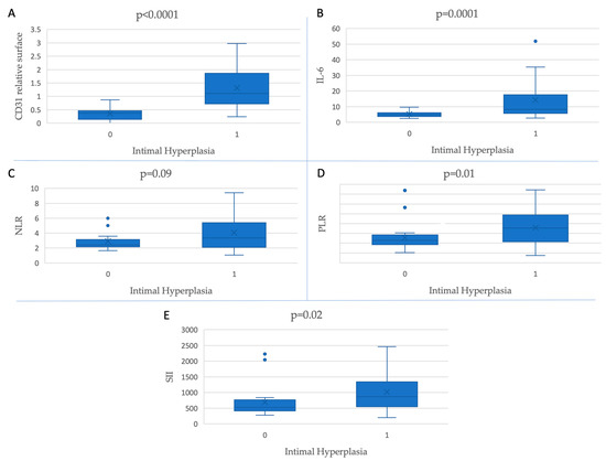 The systemic inflammatory biomarkers (NLR, PLR, SII, and IL-6) showed an association with intimal hyperplasia. During morphometrical analysis, we demonstrated that CD31-positive relative surfaces have a higher baseline value in group 2 patients, and are also associated with intimal hyperplasia. The correlation test between a higher baseline value of the systemic inflammatory markers and a higher CD31-positive relative surface in the intimal hyperplasia area showed a positive result.