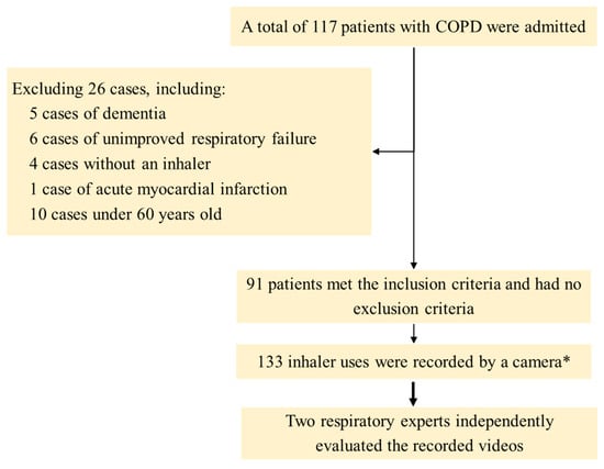 We collected data on 117 patients with COPD admitted to the hospital, of whom 26 cases were excluded, including 5 cases of dementia, 6 cases of unimproved respiratory failure, 4 cases without an inhaler, 1 case of acute myocardial infarction, and 10 cases under 60 years old. Therefore, a total of 91 cases were included in the analysis. After receiving treatment for exacerbation of COPD, patients who are able to maintain a SpO2 level of over 92% when breathing room air for more than 12 h will be required to perform the technique of using the available inhalers at home. If the patient had multiple inhalers of the same type, such as a pressurized metered dose inhaler (pMDI) containing fluticasone propionate/salmeterol and a pMDI containing salbutamol, only one representative device was used. If the patient used multiple types of inhalers, such as a soft mist inhaler (SMI) containing tiotropium and a dry powder inhaler (DPI) containing fluticasone propionate/salmeterol, they would be required to perform their technique for using both devices in separate instances. During the procedure, patients were recorded using digital devices with a resolution of at least 720 pixels in a well-lit environment, ensuring a clear view of the patient’s nose, mouth, and abdomen. The videos were blurred from the eye area upwards and sent to two respiratory experts to separately evaluate the accuracy of inhaler use using checklists. The study protocol is illustrated in Figure 1.