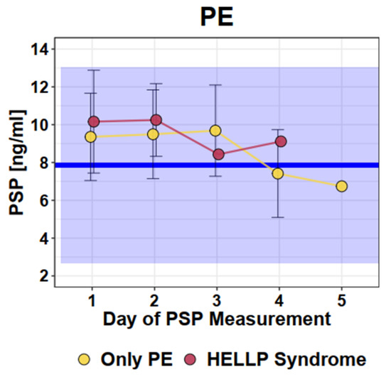 Women who suffered from PE or HELLP syndrome displayed significantly increased PSP values at initial presentation (mean 9.8 ng/mL, SD 2.6) compared to normal singleton pregnant women (mean 7.9 ng/mL, SD 2.6, p ≤ 0.001). However, most measured values (90.6%) in women with PE/HELLP were within the normal range of PSP values of healthy pregnancies. Comparing patients with PE (mean 9.6 ng/mL, SD 2.5) and HELLP syndrome (mean 10.2 ng/mL, SD 2.7), no difference in repetitive PSP measurements up to Day 5 was observed: (p = 0.49). Graphical representation of the longitudinal PSP values in women with PE or HELLP syndrome is presented in Figure 1.