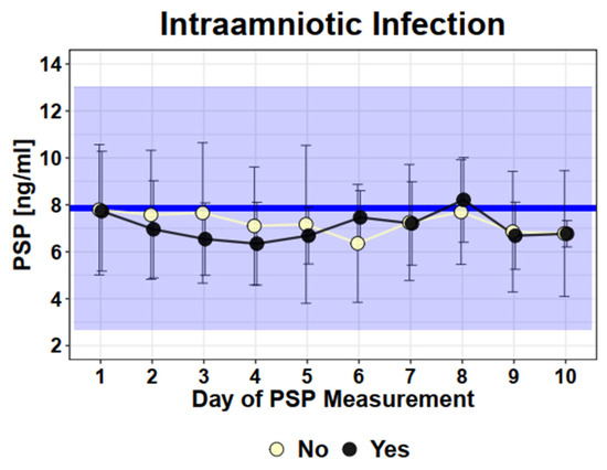 Longitudinal PSP values in PPROM patients with intraamniotic infection (yes) or without (no). Legend—Dots and error bars: Mean +/− SD; Blue line: Mean of healthy singleton pregnancy values; Blue Square: 95% CI of healthy singleton pregnancy values (Mean +/− 2 × SD).