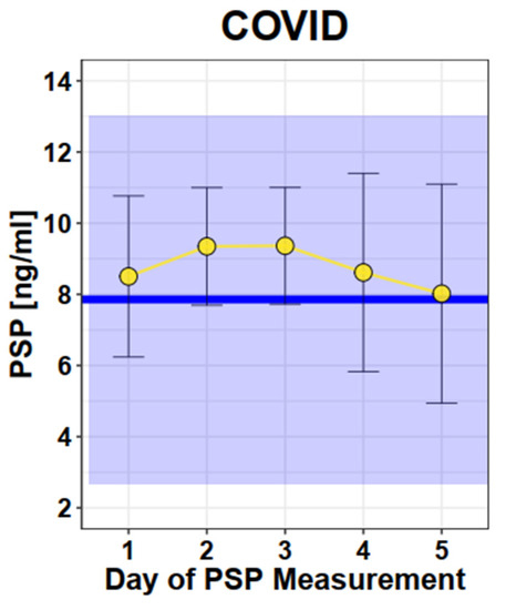 The mean value of PSP in COVID-19-affected pregnant women was 8.5 ng/mL (SD 2.3). There was no significant change in the PSP value over the time of hospitalization (graphically shown in Figure 4). The PSP values of these women were not increased compared to normal healthy single pregnancies (p = 0.24).
