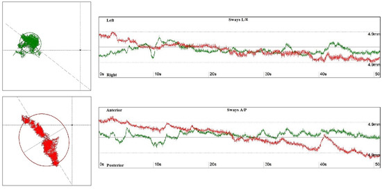 The surface area of the ellipse determined by the center of gravity with eyes open (green) and eyes closed (red)—left side. The graph shows the ranges of tilts in the anterior–posterior (A/P) and medial–lateral positions (L/P), with eyes open (green) and eyes closed (red)—right side.