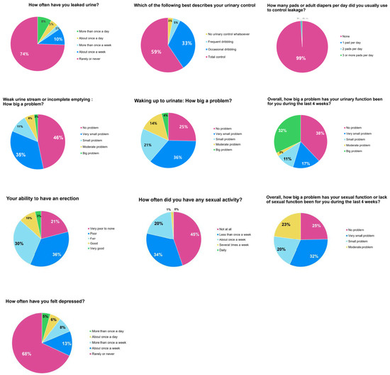 Figure 1 presents the results of relevant EPIC questionnaire items. Regarding the frequency of urine leakage, 74% indicated that such episodes occurred rarely or never and 8% indicated that they occurred more than once per day. Additionally, 99% of patients indicated that they did not use pads or adult diapers, while 1% indicated that they used more than three sheets per day. Regarding urinary control, 59% indicated that they had total control, 33% indicated occasional dribbling, and 3% indicated that they did not have urinary control. Regarding a weak urine stream or incomplete emptying, 46% indicated that this was not a problem, 35% indicated that it was a very small problem, and only 8% indicated that it was a moderate-to-big problem. Regarding nocturia, 25% of patients indicated that it was not a problem and 36% indicated that it was a very small problem, while 18% indicated that it was a big problem.