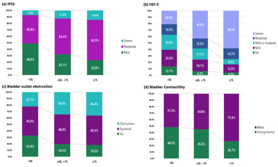 Proportions are shown according to age group for (a) the mean International Prostate Symptom Score (IPSS), (b) the mean International Index of Erectile Function-5 (IIEF-5) score, (c) bladder outlet obstruction, and (d) bladder contractility.