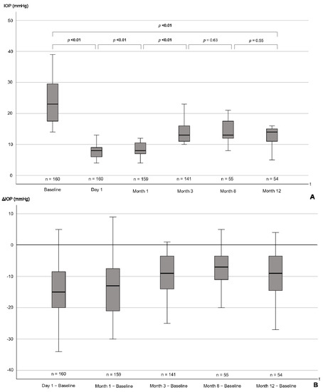 (A) Boxplots showing IOP from baseline to 12 months postoperatively. p-values for the difference between individual follow-up timepoints, as well as for the baseline comparison to 12 months, are presented. (B) Boxplots showing the reduction in IOP from baseline at the distinct follow-up timepoints. p-values are from Wilcoxon signed-rank tests. p-values ≤ 0.05 are highlighted in bold. Note that distances between the time intervals are not to scale. IOP = intraocular pressure, mmHg = millimeters of mercury, t = time, Δ = difference.