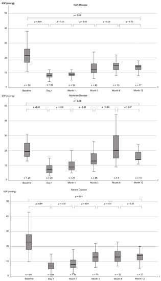 Boxplots showing IOP from baseline to 12 months postoperatively for disease severity cohorts (early, moderate, and severe). Note that distances between the time intervals are not to scale. p-values for the difference between individual follow-up timepoints, as well as for the comparison of baseline to the 12 month follow-up date, are displayed. p-values are from Wilcoxon signed-rank tests. p-values ≤ 0.05 are highlighted in bold. IOP = intraocular pressure, mmHg = millimeters of mercury, t = time.