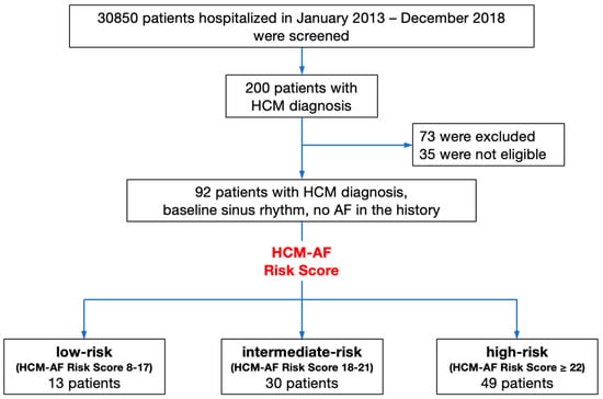 According to the HCM-Risk Score, the whole HCM population was stratified into three subgroups: a subgroup with a low risk of AF (N = 13/14.2%), a subgroup with an intermediate risk of AF (N = 30/32.6%), and a subgroup with a high risk of AF (N = 49/53.2%).