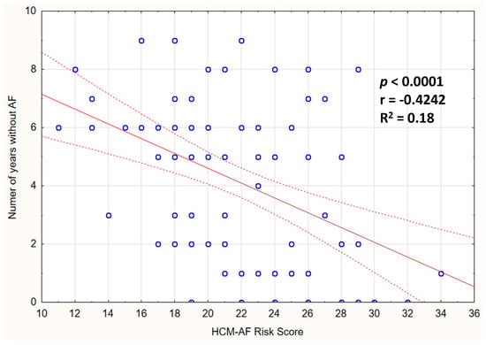 Correlation of the HCM-AF Risk Score with the number of years free from AF in HCM patients.