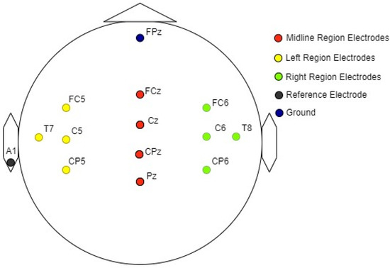 Electrical activity in response to auditory stimuli was recorded from 12 electrode sites on the scalp. The arrangement of specific electrode sites used for the recording of auditory evoked potentials (AEP) is shown in Figure 3 [49,50]. The reference electrode was positioned on the left earlobe, while the ground electrode was placed in the lower position on the forehead (FPz), following the 10–20 electrode placement system [51,52].