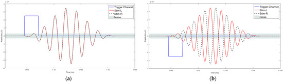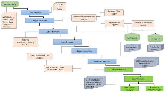 After the data acquisition process was completed, data processing and analysis were carried out offline. Figure 4 illustrates the workflow followed for data processing and analysis. The data were imported as an array into MATLAB. This contained the data of the captured EEG channels, the trigger channels and the stimulus channels. Further processing of signals was carried out in MATLAB R2017b using the EEGLAB v2019.1 toolbox. The sampling rate for EEG data acquisition is 19.2 kHz and the Nyquist frequency is 9.6 kHz, much higher than required for analysing the frequency ranges in the human AEPs. In the pre-processing stage, the EEG data were down sampled to 2048 Hz [53]. The process of down sampling ensures that the filtering process in the preprocessing stage is computationally efficient and improves the roll-off ability of the filters. The next step in data pre-processing was to extract the accurate trigger times by removing false triggers and checking whether 1000 triggers were found in total. The detection of the triggers was carried out by checking the time between two triggers (0.518 s or 0.548 s). If a shorter time delay was found, the corresponding trigger was rejected. The trigger channel data captured by the amplifier were used to synchronize the averaging process. The 18 ms input stimuli, masked in noise in both the homophasic and the antiphasic conditions, were used to evoke the Middle Latency Response (MLR) and the 48 ms input stimuli, masked in noise in both the homophasic and the antiphasic conditions, were used to evoke the Late Latency Response (LLR). As shown in Figure 5, the actual triggers were detected by analysing the right ear stimuli (Stim-R) and left ear stimuli (Stim-L) together with the trigger timing. Figure 5a,b, shows that the triggers at the start of each stimulus were detected accurately. Once the triggers were detected, artefacts and noise were removed from the EEG signals to obtain clear evoked responses for further processing and analysis [54]. The down sampled data were then filtered using an FIR filter with a Hamming window. A low cut-off frequency of 1 Hz was applied to the data to remove slow drift noise and DC components from the signal. The next stage of data processing involves epoch generation. The start of the epoch was determined using the trigger signal, which was delivered synchronously with the stimulus [20]. The duration of the epoch is based on the duration of the signal and the interval between the signals. Using the trigger signal, the responses to homophasic and antiphasic stimuli were identified. The trial was then cut into suitable time frames for analysis. Thus, the evoked potentials were then split in epochs (pre-defined short duration of time) [55]. In the present study, the time windows of interest are the MLR, which ranges from 20 ms to 100 ms, and the LLR from 50 ms to 500 ms after the start of the input stimuli. Epochs with amplitudes larger than 150 mV were rejected. Baseline correction was conducted for the remaining trials [56].