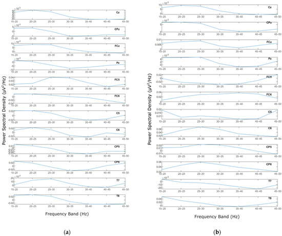 Welch’s method was applied to the MLR and LLR epochs of the EEG signals for each electrode. In other words, Welch’s calculation was conducted on all the extracted epochs of MLR and LLR data for each channel and each subject. Welch’s method generated PSD values for every calculated frequency on the signal of each epoch. The PSDs from all trials were then averaged. Once the averaged PSD of every subject was calculated, further analysis was conducted on more specific frequency bands. In the current study, the frequency range of 15–50 Hz was the objective [20,50]. The PSDs of every channel in all subjects were then trimmed into 15–50 Hz. For further analysis, the trimmed frequency was then separated into 5 Hz bands, resulting in 7 bands: 15–20 Hz, 20–25 Hz, 25–30 Hz, 30–35 Hz, 35–40 Hz, 40–45 Hz, and 45–50 Hz. The PSD for every band was then averaged, with the high boundary of the band not included, i.e., for 15–20 Hz, the averaged PSD data does not include 20 Hz (15 ≤ f < 20). The results are seven mean PSD values for every channel and every subject for two input stimuli (homophase and antiphase) of five different frequencies. Figure 6a,b represent mean PSD values for every EEG channel for one subject study in the homophasic and antiphasic conditions, respectively.