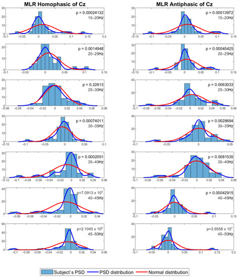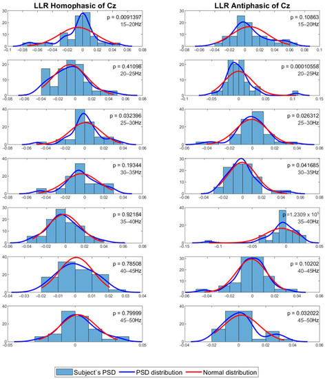 Normal distribution for seven different frequency bands for 500 Hz LLR Cz channel.