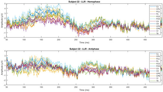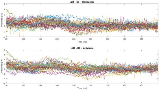 ERP wave peak components of homophase and antiphase for MLR and LLR.