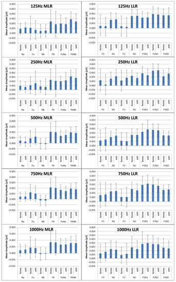 The Shapiro–Wilk test was conducted to examine the normality of the results. Since the visual inspection shows similarity across channels for the same subject, subject-wise data grouping for the tests was conducted, i.e., it was checked whether the distribution was normal among channels for the same subject. The normality results show that all peak categories have normal distribution for almost all subjects. Since the peak categories show a normal distribution trend, they may be averaged among subjects for each category separately. The results of averaged peaks among channels for each subject were converted into absolute values prior to the averaging of all subject peak values in each category. The use of absolute values when analysing peak amplitudes is consistent with the literature because it allows for the comparison of peak amplitudes across different conditions and subjects [66]. From the averaged results, the peaks of the MLR and LLR varied with stimuli of different frequencies.