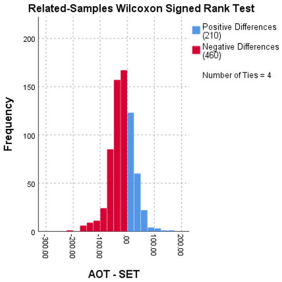 Figure 1 used the Wilcoxon signed-rank test to examine the difference between SET and AOT. The data were not normally distributed (N = 674), and the results showed a significant difference between the SET and the AOT (p < 0.0001). The median difference between the SET and the AOT was statistically significant (Mdn = 31.00, 95% CI [25.00, 36.00]). Furthermore, the data ranged from 73 to 300, with a mean of 136.59 (SD = 32.28), indicating that the SET is, on average, longer than the AOT. These results suggest that surgeons may overestimate the surgery time required, affecting surgical planning and resource allocation.